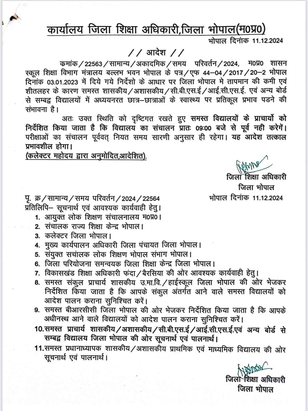 इससे पहले, भोपाल के जिला शिक्षा अधिकारी ने आदेश जारी कर अगले आदेश तक जिले के सभी सरकारी और प्राइवेट स्कूलों के खुलने का समय बढ़ा दिया है. भोपाल में सभी स्कूल अब सुबह 9 बजे से खुलेंगे. भोपाल जिला शिक्षा अधिकारी के आदेश के अनुसार जिलेभर के स्कूल सुबह 9 बजे के पहले नहीं खोले जा सकेंगे. अब गुरुवार से स्कूल नए समय पर खुलेंगे. यह निर्देश सभी सीबीएसई, आईसीएसई और एमपी बोर्ड से जुड़े स्कूलों के लिए जारी किया गया है.