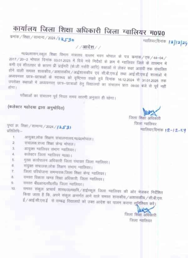 मध्य प्रदेश में पड़ रही कड़ाके की ठंड, कोहरे और तापमान के उतार-चढ़ाव को देखते हुए ग्वालियर के स्कूल खुलने का समय बढ़ा दिया गया है. शीतलहर के चलते कलेक्टर रुचिका सिंह चौहान ने आदेश जारी किया है. जारी आदेश में साफ कहा गया है कि 8वीं तक के सभी स्कूल 16 दिसंबर से 31 जनवरी 2025 तक सुबह 9 बजे खुलेंगे. यह आदेश सभी सरकारी और निजी स्कूलों सहित सीबीएसई और आईसीएसई पर लागू होगा. इसके अलावा आंगनबाड़ियों का समय सुबह 10 बजे से दोपहर डेढ़ बजे तक होगा.