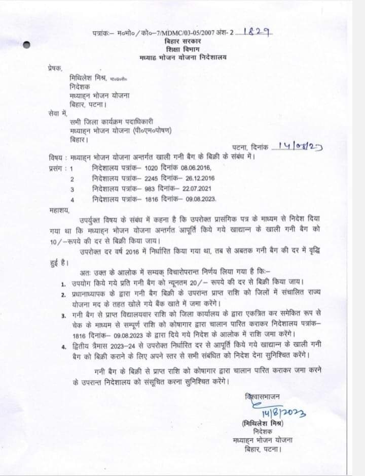 पत्र के माध्यम से मिड डे मील डायरेक्टर मिथिलेश मिश्रा ने सभी जिला कार्यक्रम अधिकारियों (मध्याह्न भोजन) को निर्देश दिया है कि वे राज्य सरकार द्वारा संचालित विद्यालय के छात्रों के लिए मध्याह्न भोजन तैयार करने के लिए परिवहन किए गए अनाज की खपत के बाद बचे हुए बोरों की बिक्री सुनिश्चित करें.