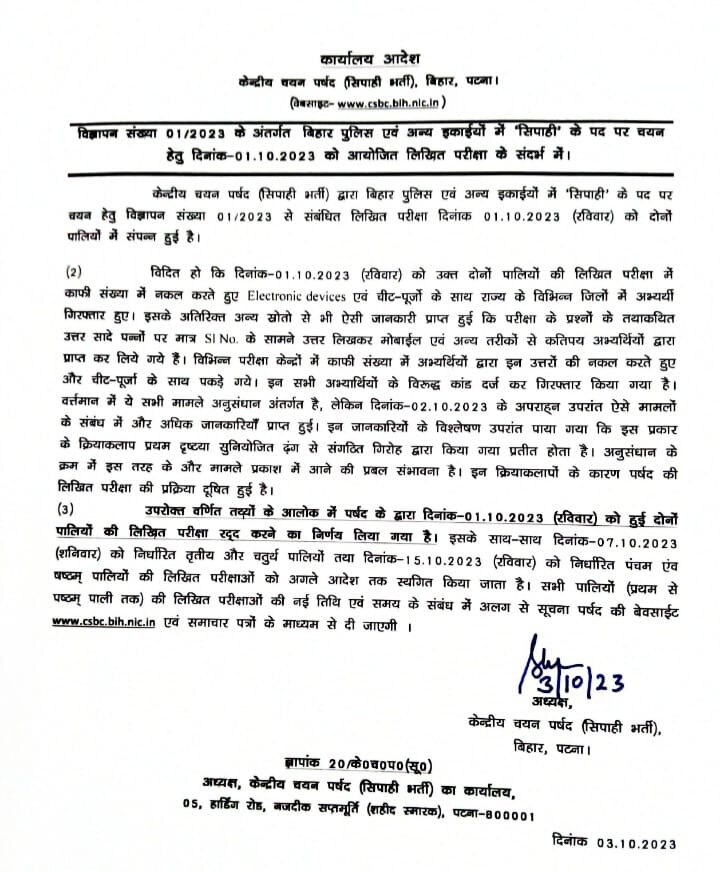 केंद्रीय चयन पर्षद ने लेटर जारी कर दी यह जानकारी दी है. जानकारी के अनुसार दोनों पालियों की परीक्षा रद्द कर दी है. इसके अलावा यह भी फैसला लिया गया है कि 7 और 15 अक्टूबर को होने वाली परीक्षा भी अगले आदेश तक स्थगित रहेगी. बता दें कि कुल 21391 पदों के लिए ये परीक्षा ली जा रही थी. इस परीक्षा के जरिये बिहार पुलिस में खाली पड़े पदों को भरा जाना था.