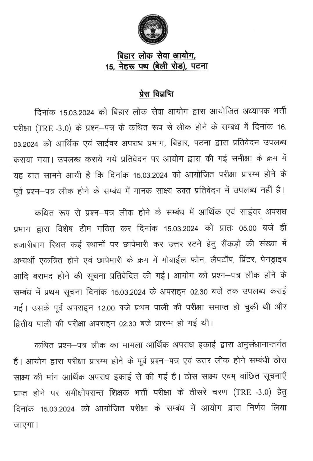BPSC TRE 2023: BPSC ने अपने बयान में कहा है कि 16 मार्च को आर्थिक एवं साइबर अपराध प्रभाग द्वारा प्रतिवेदन उपलब्ध कराया गया. इसकी समीक्षा में ये बात सामने आई है कि 15 मार्च को आयोजित परीक्षा शुरू होने के पहले पेपर लीक के संबंध में मानक साक्ष्य इस प्रतिवेदन में उपलब्ध नहीं हैं.
