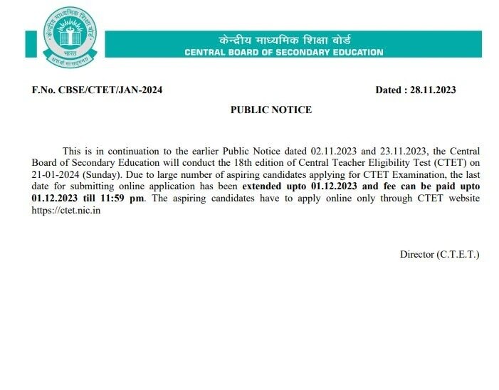 CTET January 2024: केंद्रीय माध्यमिक शिक्षा बोर्ड (CBSE) ने केंद्रीय शिक्षक पात्रता परीक्षा (CTET) जनवरी 2024 के 18वें संस्करण के लिए पंजीकरण की अंतिम तिथि एक बार फिर बढ़ा दी है. इच्छुक और योग्य उम्मीदवार आधिकारिक वेबसाइट यानी ctet.nic पर जाकर रजिस्ट्रेशन प्रोसेस से जुड़ी जानकारी प्राप्त कर सकते हैं. इस परीक्षा के लिए पहले रजिस्ट्रेशन की आखिरी तारीख 23 नवंबर थी, लेकिन बाद में इसे बढ़ाकर 27 नवंबर कर दिया गया और अब इसे 1 दिसंबर 2023 तक बढ़ा दिया गया है.