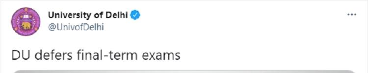 विश्वविद्यालय ने पिछले सप्ताह कहा कि यूनिवर्सिटी ग्रांड कमीशन (UGC) तथा शिक्षा मंत्रालय और गृह मंत्रालय (MHA) द्वारा जारी दिशा-निर्देशों के तहत में मई-जून की परीक्षाओं का निर्णय जल्द से जल्द लिया जाएगा. विश्वविद्यालय को छात्रों द्वारा इस संबंध में कई अनुरोध मिले थे जिसपर गौर किया गया है. दिल्ली विश्वविद्यालय के शिक्षकों ने पहले ही देश भर में COVID-19 महामारी के बीच परीक्षा के आयोजन को लेकर चिंता जताई थी.