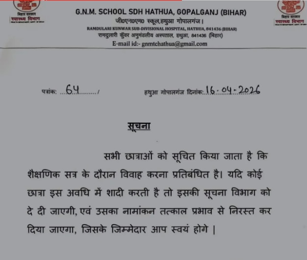 बिहार के गोपालगंज के हथुआ जी एन एम प्रशिक्षण संस्थान (नर्सिंग कॉलेज) के प्राचार्य ने एक ऐसा फरमान जारी किया जिससे छात्राओं की प्रशिक्षण दौरान शादी करना प्रतिबंधित है . इतना ही नहीं शादी करने पर नामांकन रद्द करने की चेतावनी तक दी गई है.