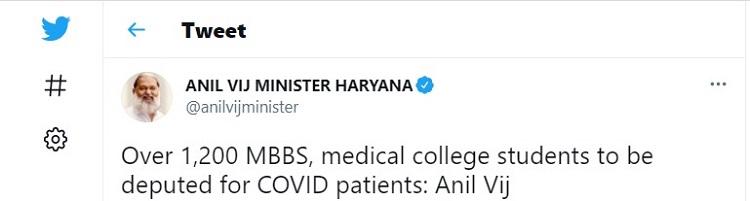 अनिल विज ने यह भी आश्वासन दिया कि राज्य में मेडिकल ऑक्सीजन की कोई कमी नहीं है. इससे पहले पानीपत अस्पताल में भर्ती कई रोगियों के रिश्तेदारों ने ऑक्सीजन की कमी की शिकायत की थी जिसके जवाब में स्वास्थ्य मंत्री ने यह जानकारी दी. विज ने कहा, 'हम COVID19 मरीजों के लिए लगभग 1,200-1,300 MBBS और PG छात्रों को ड्यूटी पर रख रहे हैं.'