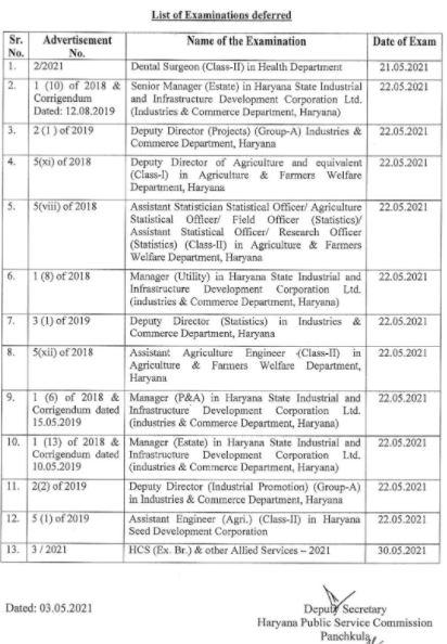 आयोग की ओर से कहा गया कि कोरोना के बढ़ते मामलों की वजह से हरियाणा लोक सेवा आयोग ने HCS समेत 13 परीक्षाओं को स्थगित किया है. साथ ही ये भी कहा गया कि स्थगित परीक्षाओं की नई डेट्स एग्जाम से कम से कम 15 दिन पहले जारी की जाएंगी.