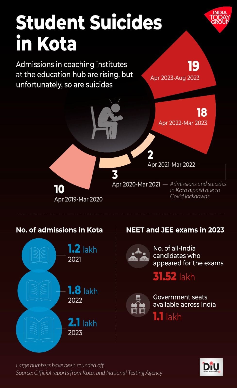 बता दें कि इस साल कोटा में हर दसवें दिन आत्महत्या हुई. जहां दो दर्जन आत्महत्याएं सरकारी आंकड़ा है. वहीं, कई छात्रों का दावा है कि यह संख्या बहुत अधिक है, कम से कम आधा दर्जन से अधिक छात्रों ने अपने गृह राज्य जाकर ये कदम उठाया. जब इंडिया टुडे ने NEET की तैयारी कर रही बिहार की एक लड़की से पूछा कि छात्र इतने दबाव में क्यों हैं, तो उसने कहा कि सर, यह प्रेशर है, माता-पिता का प्रेशर. जब हम कोटा आते हैं तो हमें एहसास होता है कि प्रेशर होता क्या है. कम से कम हम दिन में 12 से 14 घंटे पढ़ते हैं. इसलिए हम हर चीज से कट जाते हैं. फिर भी जब हमारा स्कोर खराब होता है, तो हमें अपने माता-पिता के बारे में बुरा लगता है. वे गरीब हैं और हमारा भविष्य बनाने के लिए बहुत पैसा खर्च कर रहे हैं.
