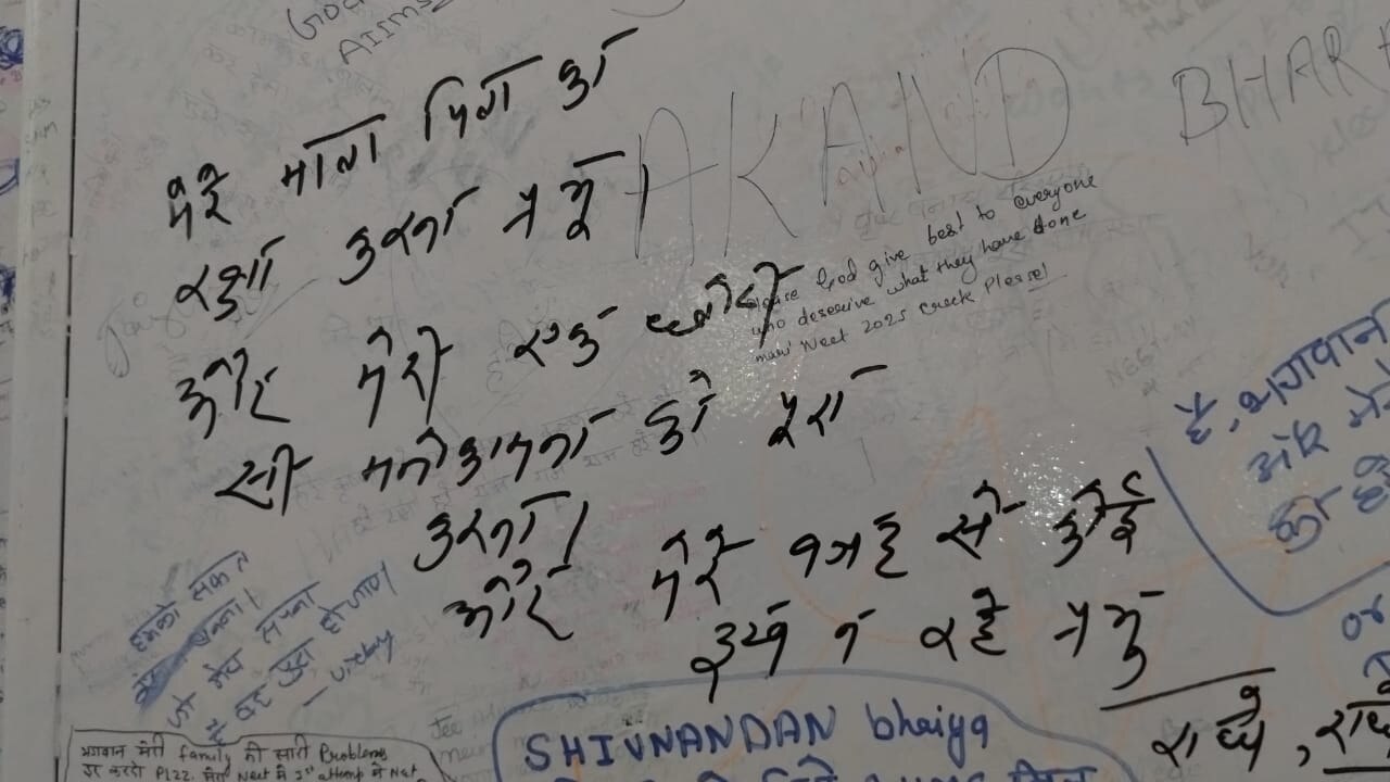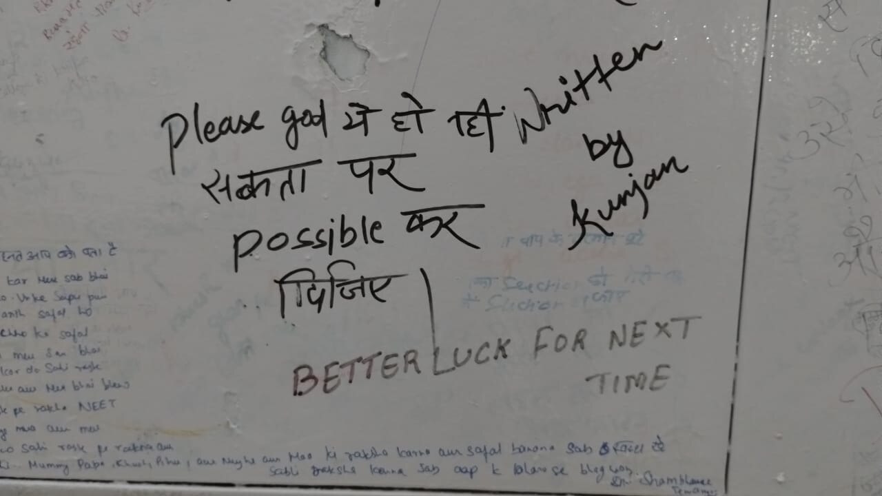 वहीं एक में लिखा है कि, "प्लीज गॉड मुझसे ये हो नहीं सकता, मेरे लिए इसे पॉसिबल कर दीजिए." ये पंक्तियां किसी के भी दिल को झकझोर देने वाली हैं और कंपटीशन के कारण छात्रों पर पड़ने वाले मानसिक दबाव का स्पष्ट प्रतिबिंब हैं. ये दीवारें महत्वाकांक्षी बच्चों की तनावपूर्ण आकांक्षाओं और स्थितियों को बयान करती पंक्तियों से पटी पड़ी हैं.