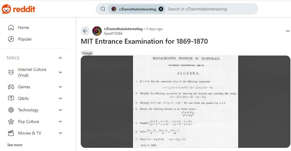 एक यूजर ने पेपर पर रिएक्शन देते हुए कहा, "यह जानकर अच्छा लगा कि मैं 1870 में MIT में शामिल हो सकता था," जिस पर एक अन्य यूजर ने लिखा, "इसमें सबसे ऊपर "अलजेब्रा" लिखा है, इसलिए हो सकता है पूरे एंट्रेंस एग्जाम पेपर के बजाय यह केवल अलजेब्रा का सेक्शन हो. शायद इसमें कैलकुलस और अन्य खंड भी हों."