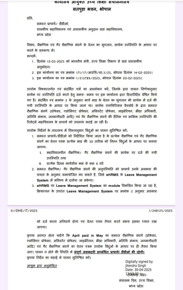 उच्च शिक्षा विभाग ने साफ किया है कि प्रोफेसरों और स्टाफ की उपस्थिति सार्थक ऐप पर दर्ज होगी. मार्च महीने का वेतन भी सार्थक ऐप में दर्ज उपस्थिति के आधार पर ही दिया जाएगा. प्राचार्य और डीडीओ को हर महीने की 30 तारीख को वेतन तैयार करना होगा, जिसमें सार्थक ऐप की उपस्थिति और हर कार्य दिवस में 6 घंटे की मौजूदगी को देखा जाएगा. इसके बाद ही वेतन बनाया जाएगा.