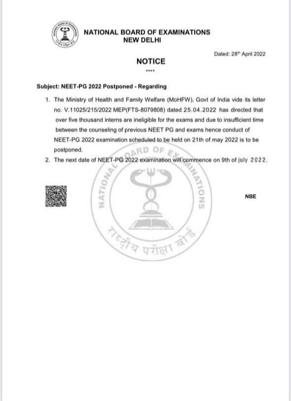 नेशनल एलिजिबिलिटी कम एंट्रेंस टेस्ट (NEET) पीजी 2022 परीक्षा स्थगित की मांग की जा रही है. कुछ डॉक्टर्स ने प्रधानमंत्री नरेंद्र मोदी (PM Modi) को लेटर लिखकर परीक्षा स्थगित (NEET PG 2022 Postponement) की मांग की. सुप्रीम कोर्ट में एक याचिका दायर किए जाने के बाद से उम्मीदवार ट्विटर पर #PostponeNEETPG2022 कैंपेन चला रहे हैं. इस बीच, नीट पीजी 2022 स्थगित को लेकर नेशनल बोर्ड ऑफ एग्जामिनेशन (एनबीई) का फेक नोटिस वायरल हो रहा है.