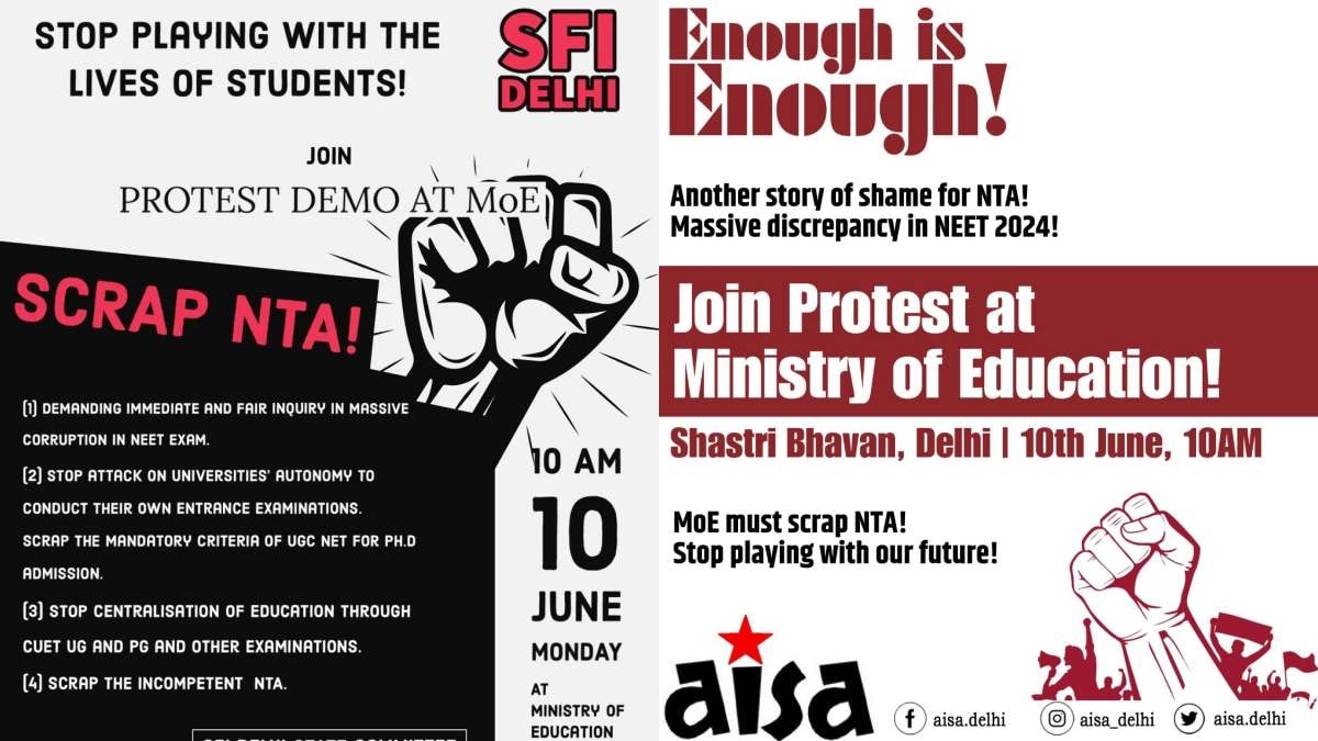 स्टूडेंट्स फेडरेशन ऑफ इंडिया (SFI) और और ऑल इंडिया स्टूडेंट्स एसोसिएशन (AISA) भी नीट रिजल्ट में गड़बड़ी को लेकर एनटीए के खिलाफ मिलकर धरना प्रदर्शन करने जा रहे हैं. दिल्ली यूनिवर्सिटी और जवाहरलाल नेहरू यूनिवर्सिटी (JNU) के छात्र संगठन 10 जून को दिल्ली में शास्त्री भवन के बाहर सुबह 10 बजे से धरना प्रदर्शन करेंगे. उनकी मांग है कि नीट एग्जाम में फर्जीवाड़े को लेकर छात्रों को तुरंत न्याय मिले, पीएचडी एडमिशन के लिए यूजीसी नेट की अनिवार्यता खत्म हो, सीयूईटी, पीजी और अन्य परीक्षाओं के जरिये एजुकेशन का सेंट्रलाइजेशन रुके और अक्षम एनटीए को खत्म करो.