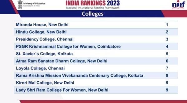 आत्मा राम सनातन धर्म कॉलेज, डीयू ने 6वां स्थान हासिल किया. इसके बाद लोयोला कॉलेज ने 7वां स्थान हासिल किया, जो 2022 में चौथे स्थान से लुढ़का है. राम कृष्ण मिशन विवेकानंद शताब्दी कॉलेज, कोलकाता ने 8वां स्थान पाया जबकि किरोड़ीमल कॉलेज और लेडी श्री राम कॉलेज ने संयुक्त रूप से 9वीं रैंक हासिल की है. दिल्ली यूनिवर्सिटी के कुल 5 कॉलेज टॉप 10 में हैं.
