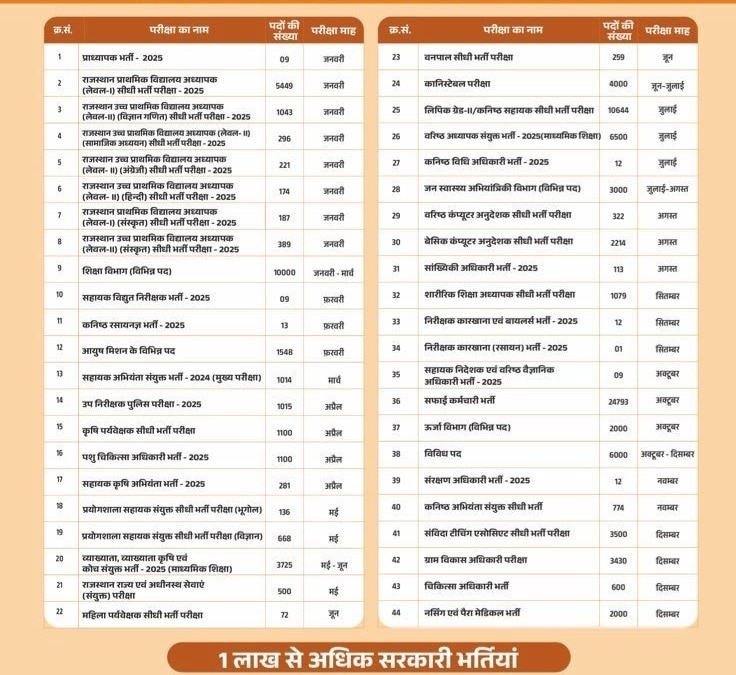 कैलेंडर के मुताबिक, जनवरी के महीने में प्राध्यापक भर्ती-2025 के लिए 9 पदों पर भर्ती निकली है. वहीं, राजस्थान प्राथमिक विद्यालय अध्यापक के कई लेवल के लिए 1 लाख से अधिक भर्तियां निकाली गई हैं.