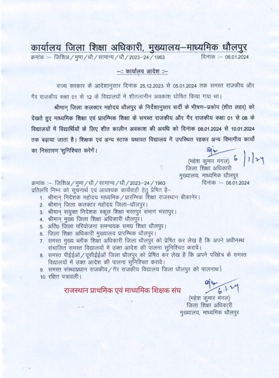 अब जिला कलेक्टर धौलपुर के निर्देशानुसार भीषण सर्दी को देखते हुए माध्यमिक शिक्षा एवं प्रारंभिक शिक्षा के समस्त राजकीय और गैर राजकीय कक्षा 1 से 8वीं तक के स्कूलों में विद्यार्थियों के लिए शीतकालीन अवकाश की अवधि को दिनांक 08 जनवरी से 10 जनवरी 2024 तक बढ़ाया जाता है. हालांकि शिक्षक एवं अन्य स्टाफ अपने समय पर स्कूल में उपस्थित रहकर अन्य विभागीय कार्यों का निस्तारण सुनिश्चित करेंगे.