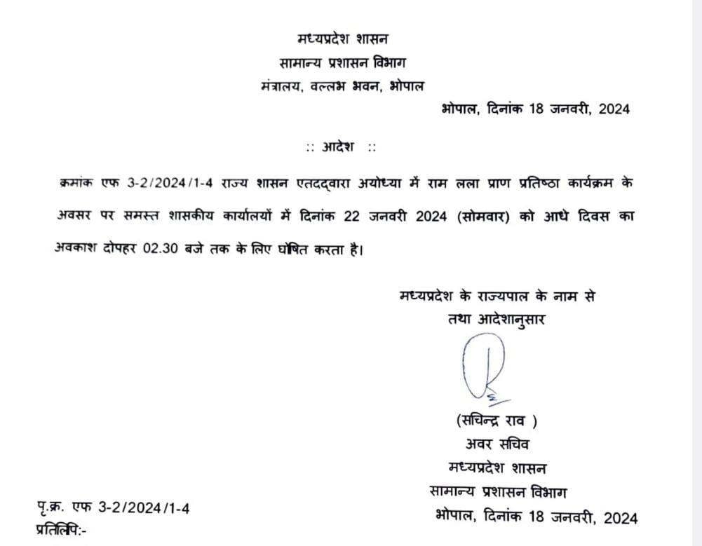 मध्य प्रदेश सरकार ने अयोध्या में भगवान श्री राम मंदिर के उद्घाटन के दिन 22 जनवरी को राज्य में आधे दिन की छुट्टी की घोषणा की है. सभी सरकारी कार्यालय दोपहर 2.30 बजे तक बंद रहेंगे.