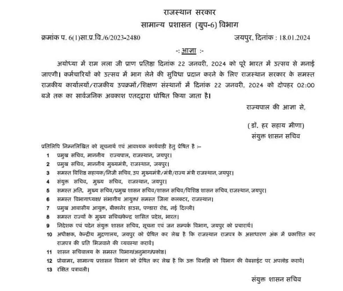 यूपी, छत्तीसगढ़ और उत्तराखंड के अलावा राजस्थान सरकार ने भी इस भव्य आयोजन को लेकर 22 जनवरी को दोपहर 2 बजे तक की छुट्टी की घोषणा की है.