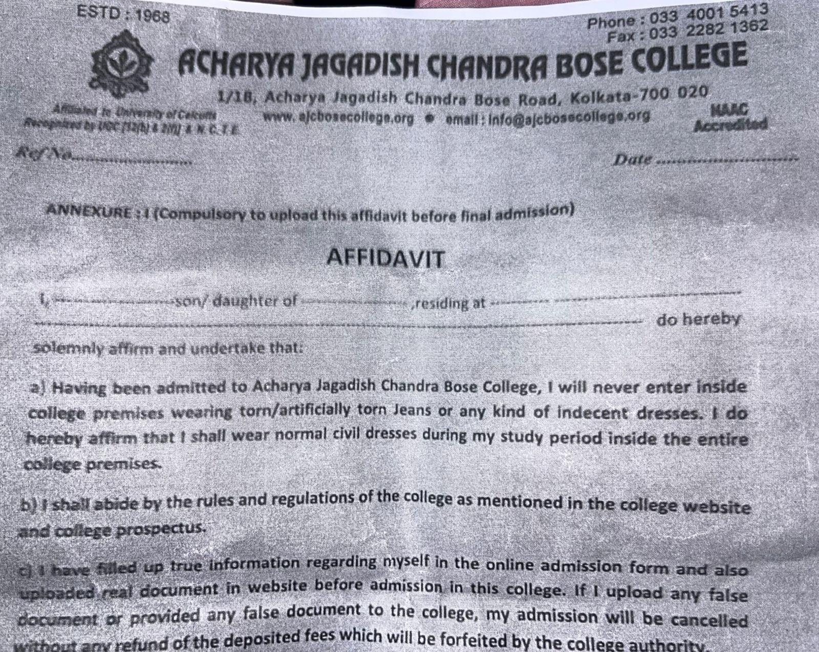 सूत्रों के मुताबिक अधिकारियों की मुख्य आपत्ति मुख्य रूप से फटी जींस को लेकर है. उनका दावा है कि इससे शालीनता में खलल पड़ता है. इसी के चलते कॉलेज अथॉरिटी ने एक नोटिफिकेशन जारी किया है. न केवल नोटिफिकेशन में कॉलेज अथॉरिटी ने फ्रेशर्स से एक हलफनामे पर हस्ताक्षर करने के लिए भी कहा है, जिसमें ड्रेस के बारे में भी बताया गया है.