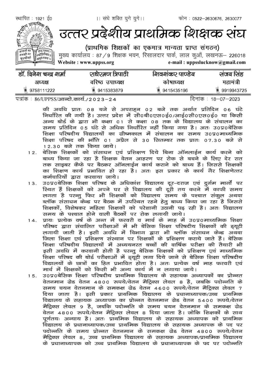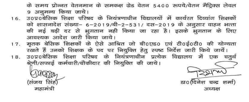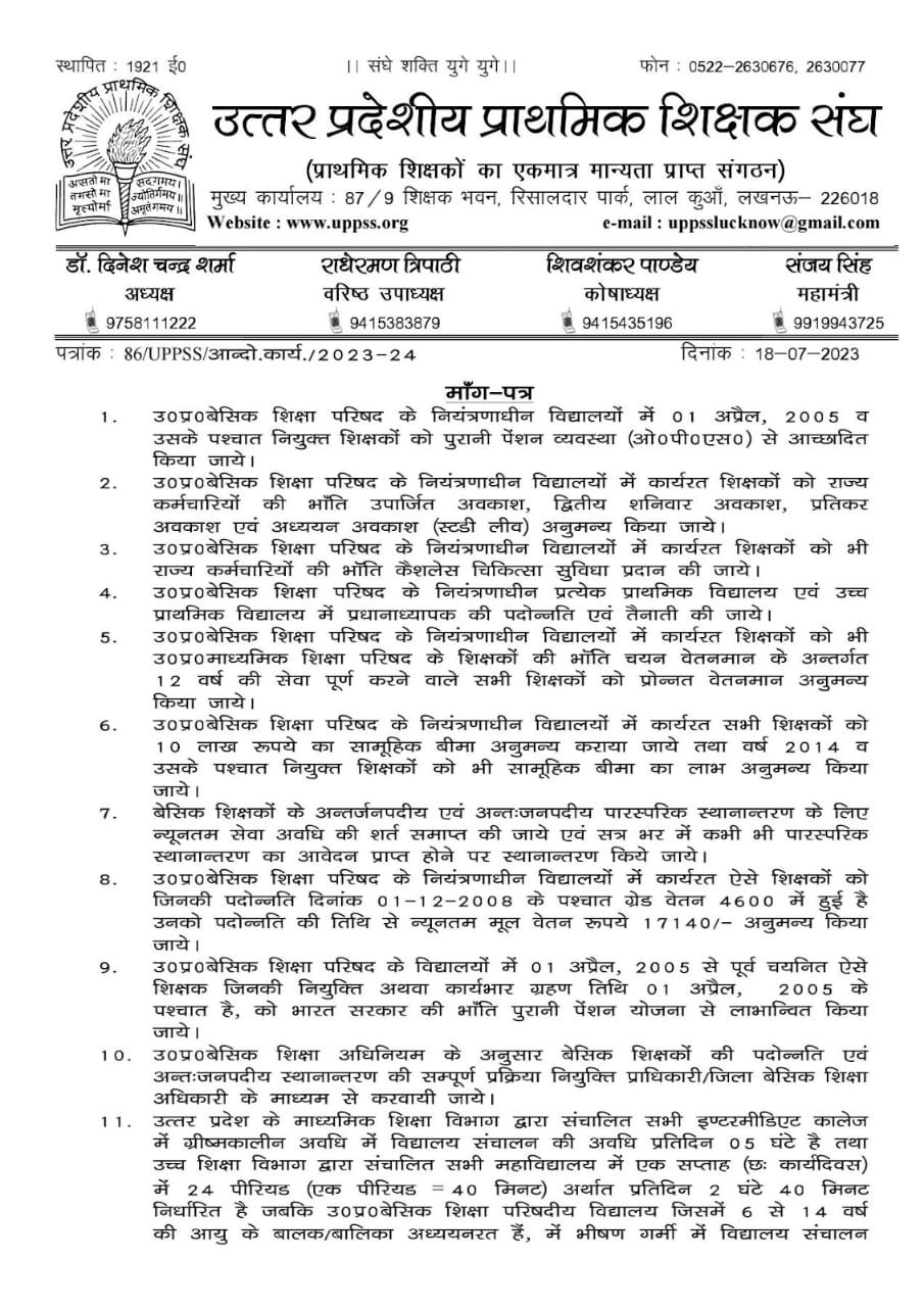 मुख्य तौर पर शिक्षकों की चार मांगे हैं जिसमें 31 EL, 15 हाफ डे लीव, कैशलेस चिकित्सा (बिना प्रीमियम), और डिजिटल हाजिरी की व्यवहारिक समस्याओं के लिए विस्तृत नियमावली. हालांकि उत्तर प्रदेशीय प्राथमिक शिक्षक संघ की ओर से शिक्षकों के लिए 18 मांगों को लेकर एक मांग पत्र जारी किया गया है. जो इस प्रकार हैं-