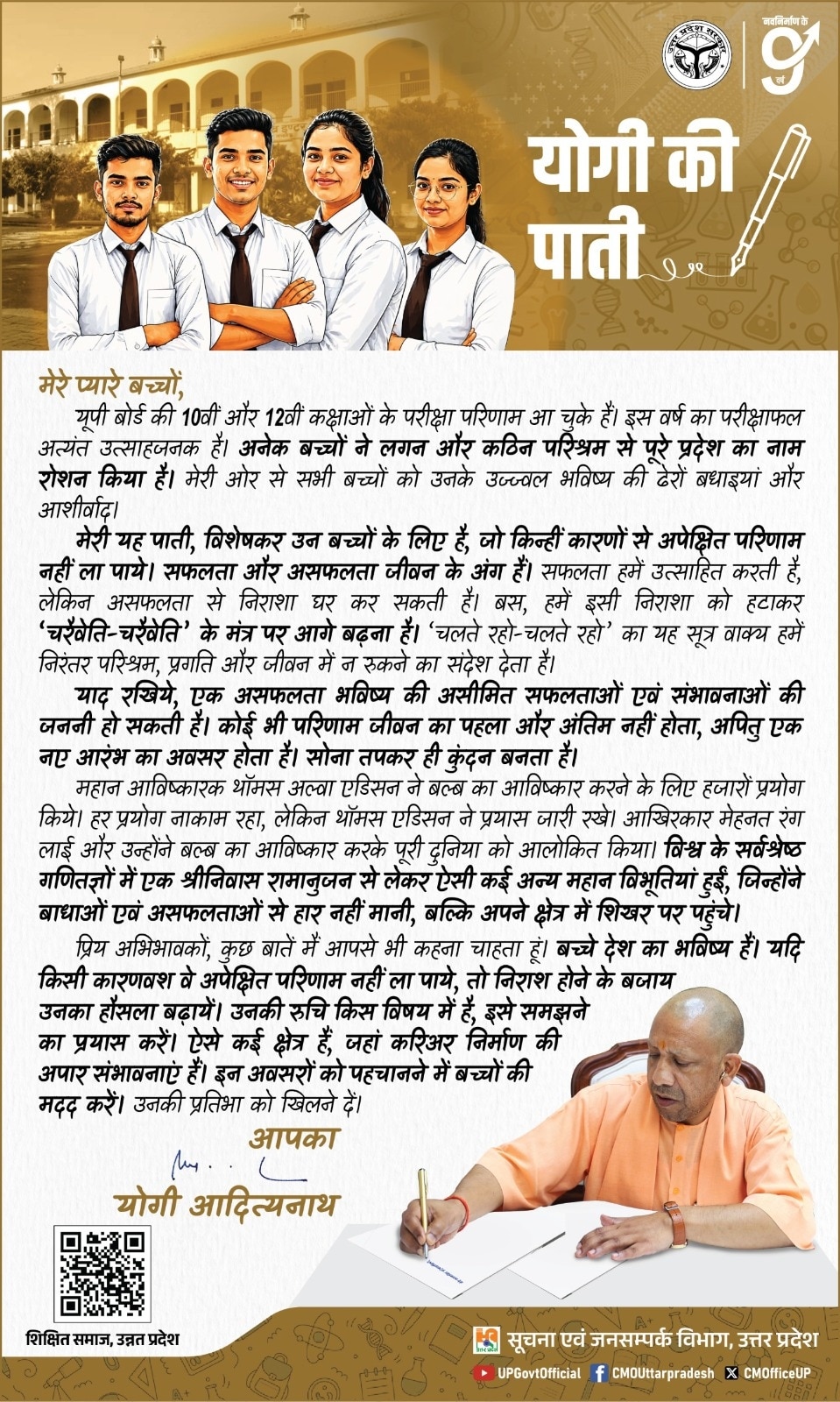 उत्तर प्रदेश माध्यमिक शिक्षा परिषद् (UPMSP) के नतीजे घोषित होने के बाद मुख्यमंत्री योगी आदित्यनाथ ने प्रदेश के लाखों छात्र-छात्राओं के नाम एक विशेष 'पाती' लिखी है. इस पत्र के जरिए सीएम ने जहां सफल छात्रों को आशीर्वाद दिया है, वहीं उन बच्चों का हाथ थामा है जो इस बार अपेक्षित परिणाम हासिल नहीं कर सके. सीएम ने स्पष्ट संदेश दिया कि एक असफलता भविष्य की असीमित सफलताओं की जननी हो सकती है.