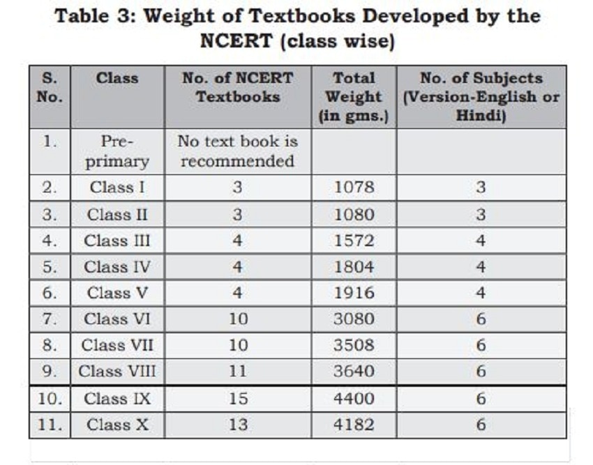 पॉलिसी में कहा गया है कि स्कूल बैग का वजन बच्चे के वजन का 10 फीसदी के आसपास होना चाहिए. इसके लिए स्कूल को वेइंग मशीन लगानी चाहिए और बच्चों के क्लास के हिसाब से स्कूल बैग की सामग्री निर्धारित करनी चाहिए. मसलन अगर आप बच्चे के स्कूल बैग में पानी की बोतल भेजते हैं तो उसके लिए स्कूलों को निर्देश है कि बच्चों को स्कूल कैंपस में पर्याप्त मात्रा में शुद्ध पानी उपलब्ध कराएं.