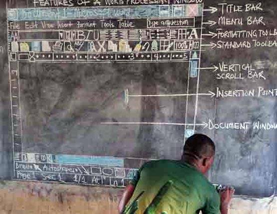 दरअसल ये स्कूल में कंप्यूटर न होने के बाद भी बच्चों को एम एस वर्ल्ड सिखा रहे हैं. वो बच्चों को एम एस वर्ल्ड पढ़ाने के लिए ब्लैक बोर्ड का सहारा ले रहे हैं और उन्होंने अलग-अलग रंग के चोक से एम एस वर्ल्ड बनाया. इस चित्र के माध्यम से ही वो बच्चों को पढ़ा रहे हैं.