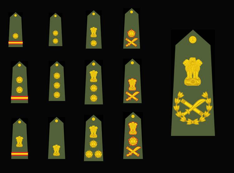 सूबेदार मेजर- लेफ्टिनेंट से नीचे के पद जॉइंट कमीशंड ऑफिसर में गिने जाते है. जॉइट कमीशंड ऑफिसर्स में सूबेदार मेजर का पद सबसे बड़ा होता है. सुबेदार मेजर की वर्दी पर एक अशोक स्तंभ के साथ 2 लाल पट्टी के बीच एक पीली पट्टी होती है.