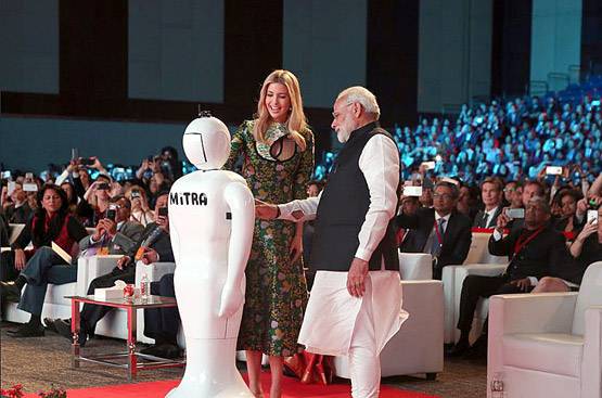 'मित्र' रोबोट बंगलुरु में बना है, इसे बालाजी विश्वनाथन और उनकी 14 सदस्य टीम ने मिलकर बनाया है. इस रोबोट ने विदेशी मेहमान इवांका का नमस्ते करके स्वागत किया.