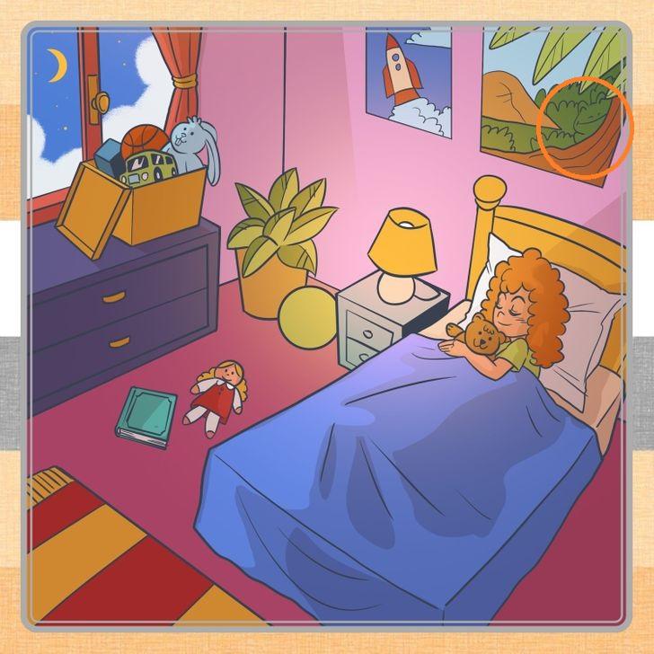 आप इस तस्वीर में देखेंगे कि कमरे में एक लड़की अपने टॉय के साथ बेड पर सो रही है. इस कमरे में कई खिलौने, किताब और कुछ पेंटिंग्स भी हैं और खिड़की से बाहर का दृश्य नजर आ रहा है. जिसमें चांद निकला हुआ है और बादल छाए हुए नजर आ रहे हैं. लेकिन इस तस्वीर में मेंढक भी है. क्या आप इसे देख पा रहे हैं ?