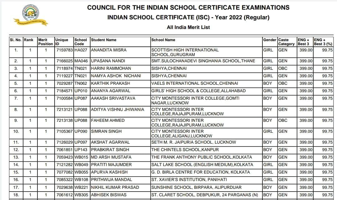 आईएससी बोर्ड परीक्षा 2022 में कुल 18 छात्रों को 99.75 प्रतिशत के साथ रैंक 1 मिली है.
