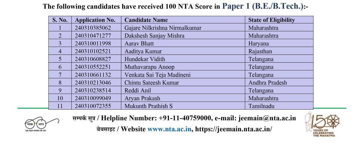 एनटीए ने रिजल्ट के साथ, जेईई मेन्स सेशन-2 की फाइनल आंसर-की के बाद जेईई एडवांस्ड, अखिल भारतीय रैंक होल्डर्स और राज्य-वार टॉपर्स की कट-ऑफ भी जारी की है. पिछले साल 2023 की तुलना में इस साल 13 अधिक यानी 56 उम्मीदवारों ने 100 परसेंटाइल हासिल किए हैं. वहीं इस साल भी सबसे ज्यादा 100 परसेंटाइल स्कोर करने वाले उम्मीदवारों के राज्य में तेलंगाना टॉप पर है. पिछले साल तेलंगाना के 11 स्टूडेंट्स ने बिना किसी गलती के 100 परसेंटाइल हासिल किए थे, इस साल यह संख्या बढ़कर 15 हो गई है.