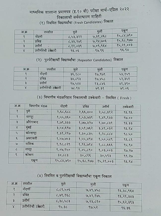 जानकारी के अनुसार, महाराष्ट्र बोर्ड के 10वीं के एग्जाम के लिए राज्य के 16,38,964 स्टूडेंट्स शामिल हुए थे. इसमें से 8,89,506 लड़के और 7,49,458 लड़कियां हैं.