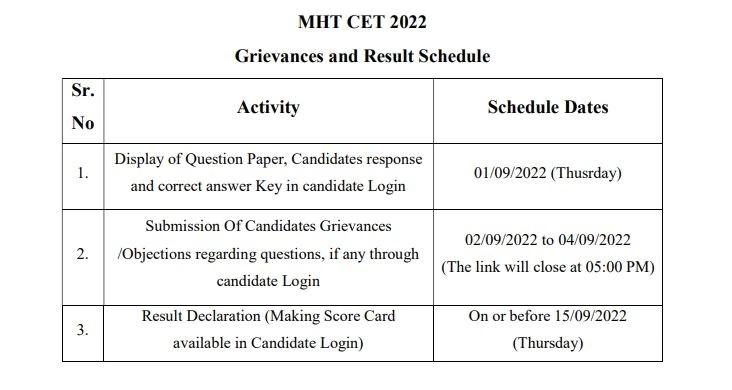 MHT CET Result 2022: स्टेट कॉमन एंट्रेंस टेस्ट सेल, महाराष्ट्र ने एक नोटिस जारी किया है जिसमें एग्जाम रिजल्ट और आंसर की डेट की जानकारी दी गई है. जो उम्मीदवार परीक्षा में शामिल हुए हैं, वे जारी नोटिस में आंसर की और रिजल्ट डेट की जानकारी जरूर चेक कर लें. नोटिस के अनुसार, MHT CET 2022 आंसर की 01 सितंबर, 2022 को जारी की जाएगी परीक्षा के रिजल्ट 15 सितंबर, 2022 को घोषित किया जाएगा. रिजल्ट जारी होने के बाद, उम्मीदवार आधिकारिक वेबसाइट cetcell.mahacet.org पर अपना रिजल्ट चेक कर सकेंगे.