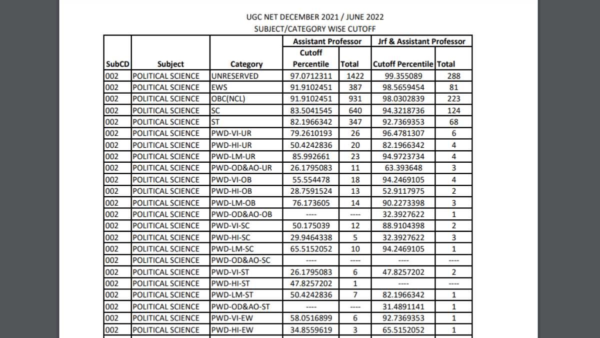 नेशनल टेस्टिंग एजेंसी ने यूजीसी नेट रिजल्ट के साथ सब्जेक्ट वाइज पर्सेंटाइल भी जारी कर दी है. उम्मीदवार इस लिंक पर क्लिक करके कट-ऑफ, पर्सेंटाइल चेक कर सकते हैं.-