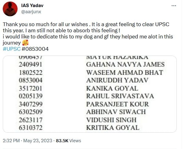 UPSC CSE के फाइनल रिजल्ट आ चुके हैं. टॉपर्स की लिस्ट में आठवें स्थान पर आए दिल्ली के अनिरुद्ध यादव के घर में भी जश्न का माहौल है. उनके पिता आईपीएस मनोज यादव को लोग दूर दूराज से फोन करके बधाई दे रहे हैं. इस बीच ट्विटर पर उनके नाम से एक मजाकिया ट्वीट को काफी प्रचारित किया जा रहा है.