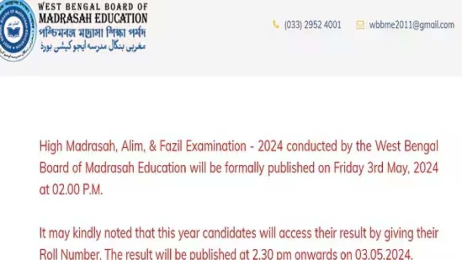 WB Madrasah Board Result 2024: पश्चिम बंगाल 10वीं बोर्ड रिजल्ट जारी होने के बाद, अब मदरसा बोर्ड रिजल्ट जारी होने जा रहे हैं. पश्चिम बंगाल बोर्ड ऑफ मदरसा एजुकेशन (WBBME) आज, 3 मई, 2024 को मदरसा बोर्ड परिणाम 2024 घोषित करेगा. आज उच्च मदरसा, आलिम और फाजिल परीक्षा 2024 के परिणाम घोषित किए जाएंगे. मदरसा बोर्ड रिजल्ट जारी होने के बाद छात्र, WBBME की आधिकारिक वेबसाइट wbbme.org और results.wbbme.org पर अपना रिजल्ट (WB Madrasah Board Result 2024) चेक कर सकेंगे.