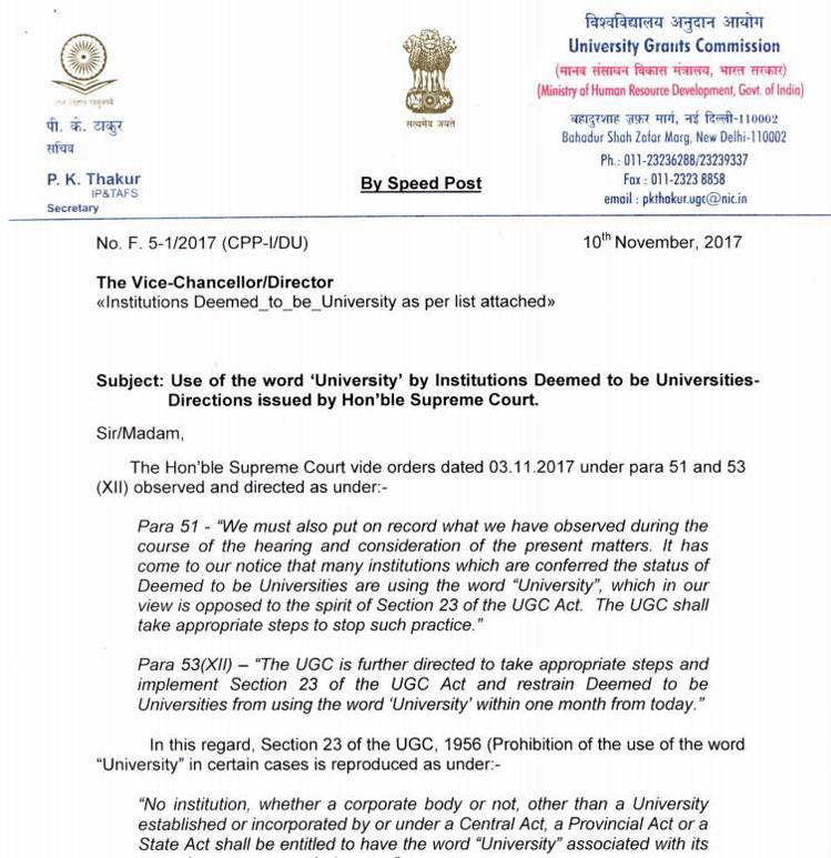 123 उच्च शिक्षण संस्थान एक महीने के अंदर 'विश्वविद्यालय' नाम हटवा लें. वहीं नाम हटवाने के बाद ये शिक्षण संस्थान ‘डीम्ड टू बी यूनिवर्सिटी’ का इस्तेमाल कर सकते हैं. बता दें कि यह सर्कुलर 10 नवंबर, 2017 को जारी किया था.