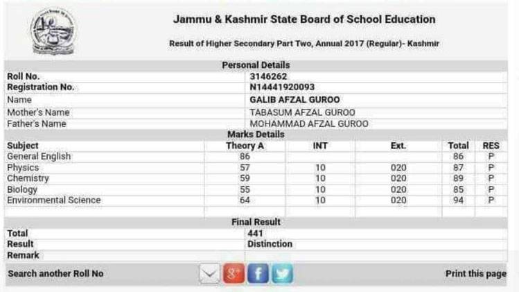 गालिब गुरु ने जम्मू-कश्मीर बोर्ड में 10वीं की परीक्षा में 95 फीसदी नंबर हासिल किए थे. बोर्ड की ओर से जारी नतीजों में उसने 500 में 475 हासिल किए थे. गालिब ने अंग्रेजी, मैथ्स, सोशल साइंस और उर्दू से परीक्षा दी थी, उसे सभी विषयों में ए वन ग्रेड मिले. हालांकि, इस परीक्षा का टॉपर ताबिश मंजूर है, जिसने 99.6 प्रतिशत नंबर हासिल किए थे.
