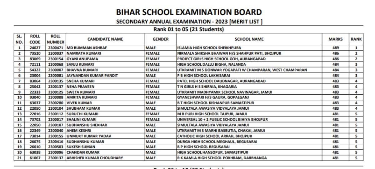 बिहार बोर्ड मैट्रिक रिजल्ट 2023 जारी हो चुका है. इस साल 21 छात्रों ने टॉप 5 रैंक में जगह बनाई है.