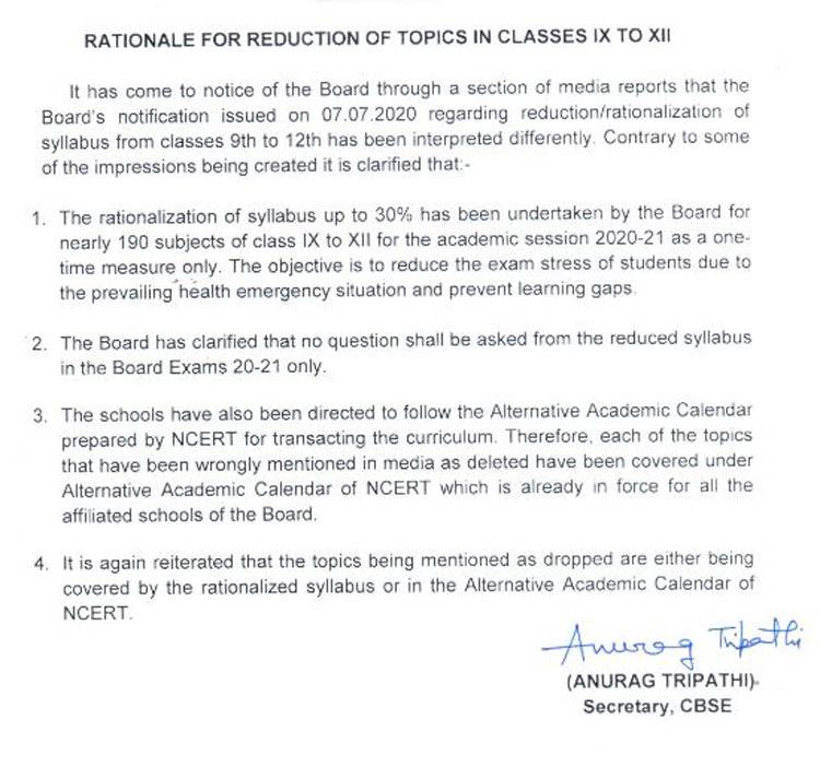 सीबीएसई सचिव अनुराग त्रिपाठी द्वारा दिए गए बयान में कहा गया कि यह फिर से दोहराया जा रहा है कि हटाए गए विषयों को या तो तर्कसंगत पाठ्यक्रम या एनसीईआरटी के वैकल्पिक शैक्षणिक कैलेंडर द्वारा कवर किया जा रहा है.