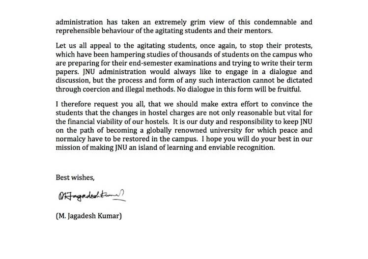 पत्र में लिखा है कि जेएनयू में शांतिपूर्ण एकेडमिक वातावरण बनाने के उद्देश्य से मैं ये पत्र लिख रहा हूं. छात्रों का एक गुट लगातार विरोध प्रदर्शन कर रहा है, इससे कैंपस के एकेडमिक और रिसर्च एक्टिविटी माहौल पर बुरा असर पड़ रहा है. हम सभी को जहां तक हो सके अपने व्यक्तिगत स्तर पर माहौल सामान्य करने की जिम्मेदारी लेनी चाहिए.