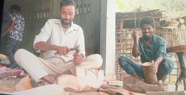 पार्क से बाहर निकलने के बाद हमने आसपास रहने वाले लोगों से बात करने का फैसला किया. हाईवे के किनारे एक दुकान दिखी, जहां लकड़ी से बने गैंडे, हाथी, हिरण और पक्षियों के शोपीस रखे थे. अंदर पहुंचे तो देखा कारीगर लकड़ी तराश रहे थे. हथौड़ा, छेनी, लकड़ी का ढेर, और उनके बीच बैठा एक आदमी जो अपने हाथों से काजीरंगा को आकार दे रहा था.