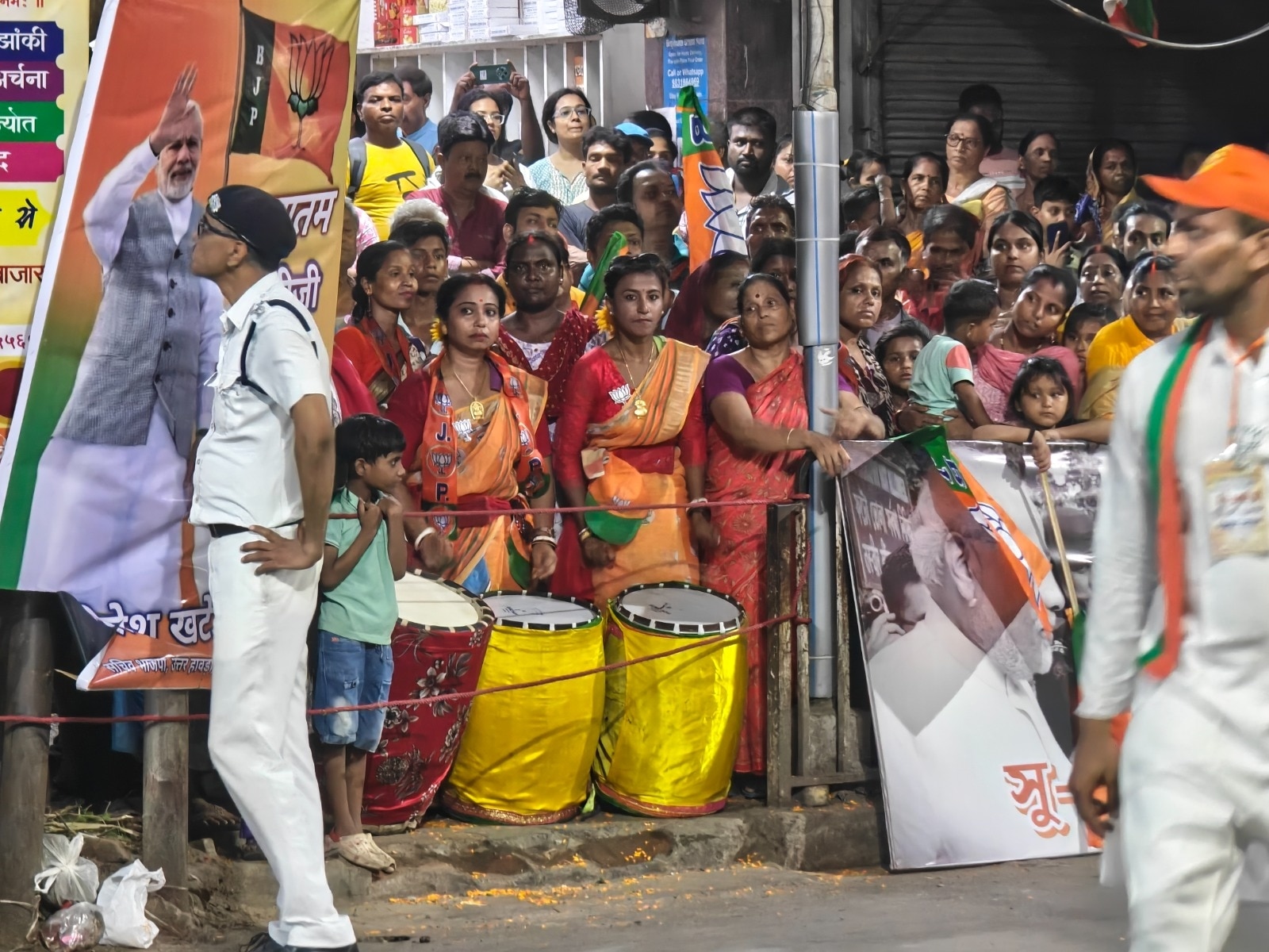 उसी के पास एक मंच पर कुछ महिलाएं ढाक बजा रही थीं. उनकी वेशभूषा काली पूजा जैसी थी. लाल-सफेद साड़ी, पारंपरिक साज-सज्जा. ढाक की गूंज, भीड़ का शोर और राजनीतिक नारों का संगम. ये सिर्फ रोड शो नहीं, बंगाल की जीती-जागती तस्वीर थी.