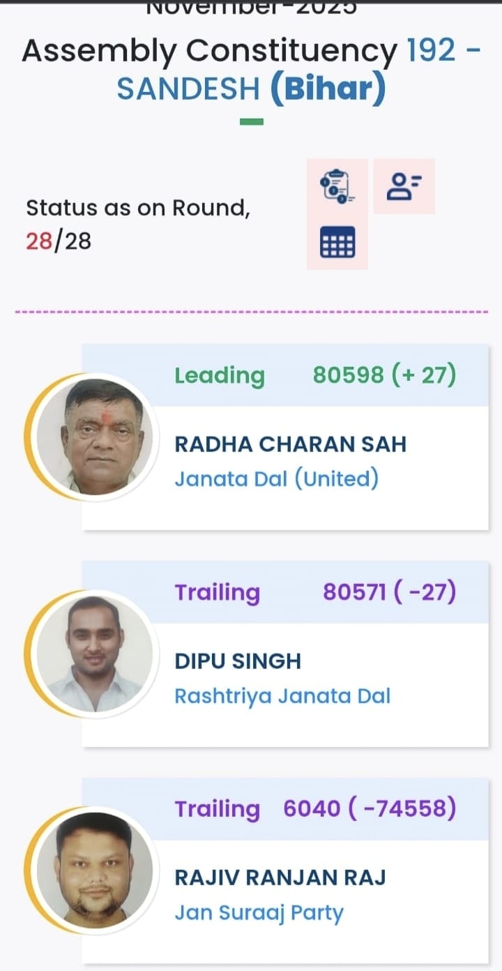 एनडीए के घटक दल भी मजबूती दिखा रहे हैं. कुढनी से बीजेपी के केदार प्रसाद गुप्ता और आरा से संजय टाइगर आगे हैं. सुपौल की छातापुर सीट पर बीजेपी आगे है. खगड़िया, अलौली, और बेलदौर सीटों पर एनडीए प्रत्याशी आगे हैं. पातेपुर से बीजेपी के लखेन्द्र रौशन और औराई से बीजेपी की रमा निषाद ने बढ़त बनाई है. इस बीच, कुम्हरार सीट पर जनसुराज के उम्मीदवार केसी सिन्हा का आगे निकलना एक बड़ा उलटफेर माना जा रहा है. वहीं, महुआ सीट पर एलजेपी के संजय सिंह भी पहले राउंड में आगे चल रहे हैं.