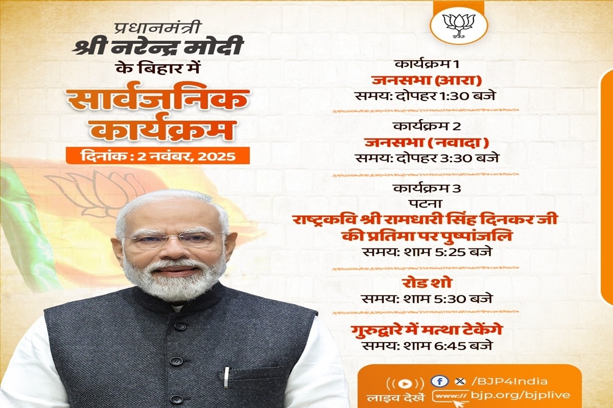 प्रधानमंत्री नरेंद्र मोदी आज दोपहर को विधानसभा चुनाव प्रचार के लिए बिहार पहुंचेंगे, जहां उनके आज तीन सार्वजनिक कार्यक्रम हैं. सबसे पहले पीएम दोपहर डेढ़ बजे आरा में विशाल जनसभा को संबोधित करेंगे और इसके बाद दोपहर साढ़े तीन बजे नवादा में जनसभा करेंगे. इसके बाद पीएम पटना में शाम करीब सवा पांच बजे राष्ट्रकवि रामधारी सिंह दिनकर की प्रतिमा पर पुष्पांजलि अर्पित करेंगे और शाम करीब साढ़े पांच बजे भव्य रोड शो करेंगे और अंत में शाम पौने सात बजे गुरुद्वारे में प्रार्थना करेंगे.