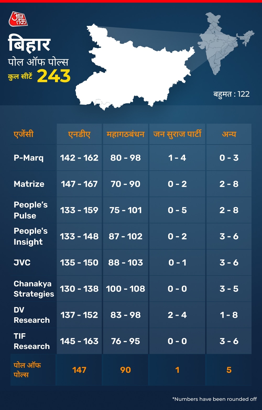 विभिन्न एजेंसियों के एग्जिट पोल के संकलन के अनुसार, Polls of Polls में NDA बहुमत के आंकड़े को पार करते हुए 147 से अधिक सीटें जीत सकता है. 243 सीटों वाली बिहार विधानसभा में बहुमत का जादुई आंकड़ा 122 है. एग्जिट पोल के अनुमानों में NDA को 2020 की 125 सीटों की तुलना में बड़ा जनादेश मिलने की भविष्यवाणी की गई है.