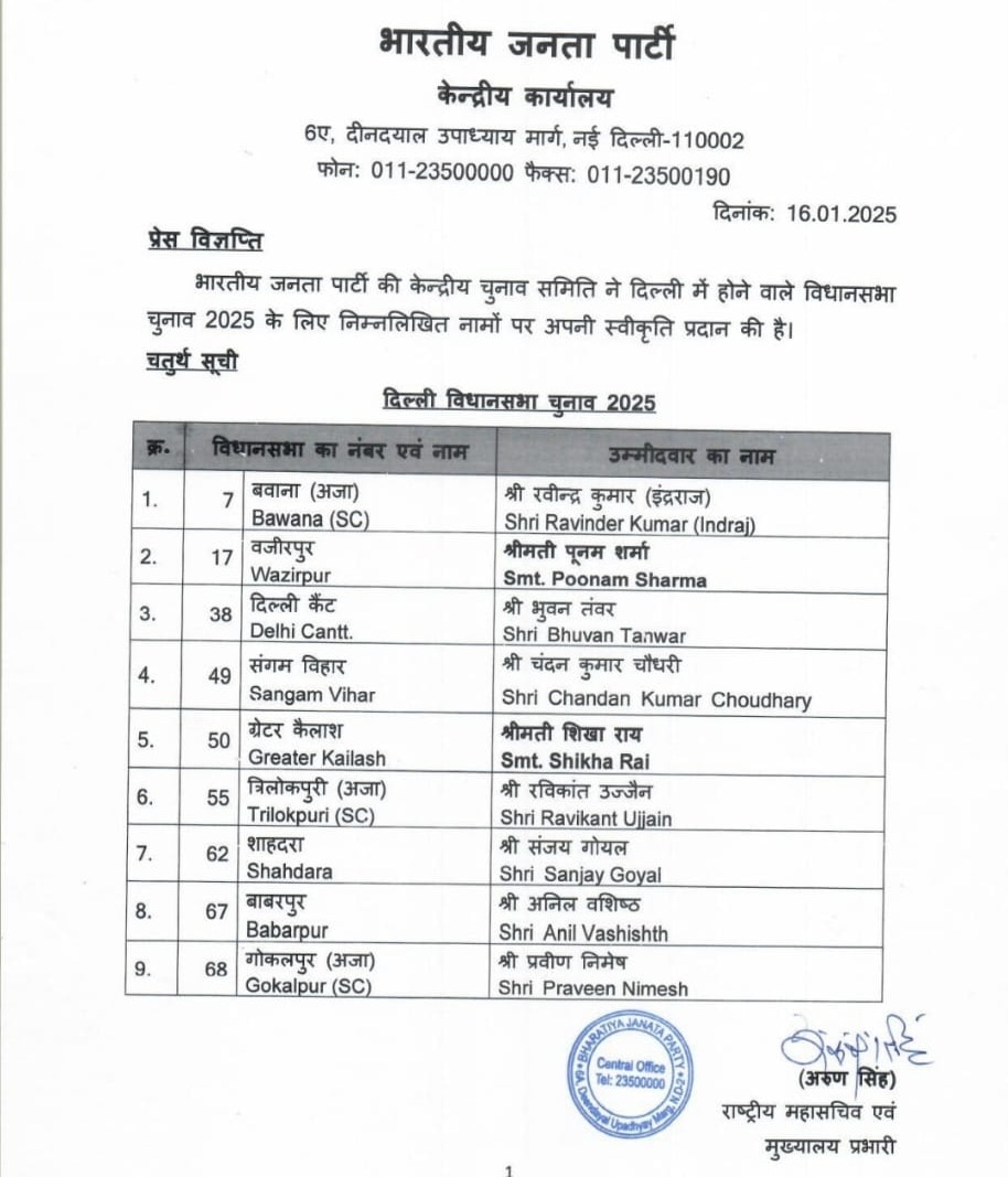 दिल्ली विधानसभा चुनावों के मद्देनजर भारतीय जनता पार्टी ने उम्मीदवारों की एक और लिस्ट जारी कर दी है. इसमें कुल 9 सीटों पर नामों का ऐलान किया गया है. बीजेपी ने ग्रेटर कैलाश सीट से AAP सरकार के विधायक और दिल्ली सरकार में मंत्री सौरभ भारद्वाज के सामने महिला को टिकट दिया गया है. बीजेपी ने यहां से शिखा राय को मैदान में उतारा है. वहीं दिल्ली कैंट से भुवन तंवर को टिकट दिया गया है.