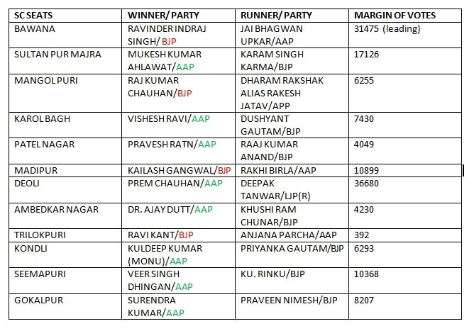 दिल्ली की चार एससी बहुल सीटें बीजेपी को भी मिली हैं, जिनमें बवाना, मंगोलपुरी, मादीपुर और त्रिलोकपुरी जैसी सीटें शामिल हैं. मसलन, आम आदमी पार्टी के बवाना सीट से जय भगवान उपकार को बीजेपी के रविंदर इंद्राज सिंह ने कमोबेश 31 हजार वोटों के अंतर से हराया है.