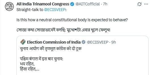 तृणमूल कांग्रेस ने चुनाव आयोग के इस ट्वीट पर तीखी प्रतिक्रिया दी है. टीएमसी ने कहा है कि क्या किसी निष्पक्ष संवैधानिक निकाय से इसी तरह के व्यवहार की अपेक्षा की जाती है?