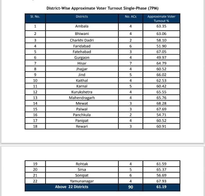हरियाणा में 11 बजे तक के जिला स्तर का मतदान प्रतिशत के आंकड़े प्रतिशत में